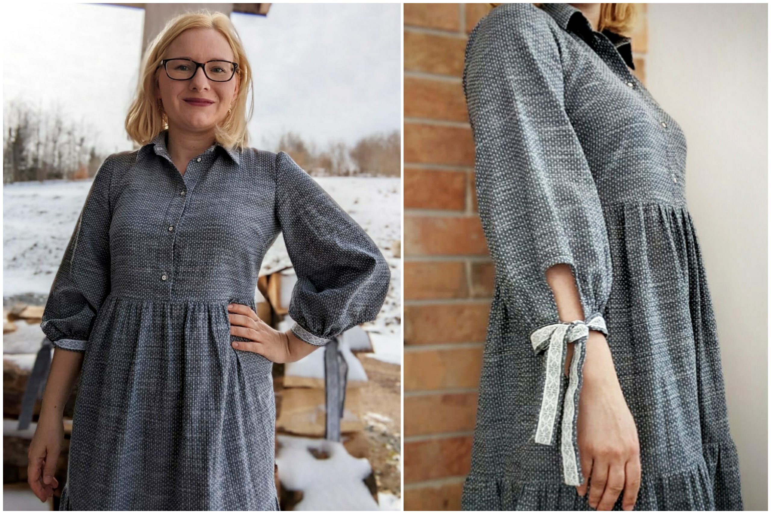 The moment I saw this fabric, I knew it had to be a shirtdress, which is one of my favourite styles. The combination of the classic look of a button-down shirt with the flowy, feminine silhouette of a dress never fails to impress me. For this one, I used my tried-and-tested Lyra pattern by Tilly and the Buttons. I’ve already made four Lyras, two in viscose, one in viscose twill, and one in needlecord. To change things up a bit, I modified the sleeves by shortening them, using the slash-and-spread method to add volume, and finishing them with ties. I also added small bits of vintage lace to the ties for a more romantic feel. While I absolutely love how they look, I must admit they are not very practical. I have already had a mishap where they got in the way while doing the dishes and I have accidentally soaked one of them in my tea. I will try different methods of tying them. Like with all my Lyra dresses, I added ties in the back too, so I can cinch it in if I want to.