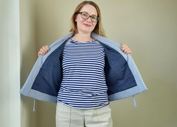 There were so many fabrics to choose from! I was tempted by some beautiful floral quilting cottons, or even the ones with a faux patchwork print, but I decided that I want my jacket to go with most of my wardrobe and so I kept it pretty neutral. I chose the Striped Seersucker for the outer layer and the Spring Jacquard Lawn in Navy for the lining. I like the little pop of contrast the lining gives every time I turn up my sleeves or untie the jacket.