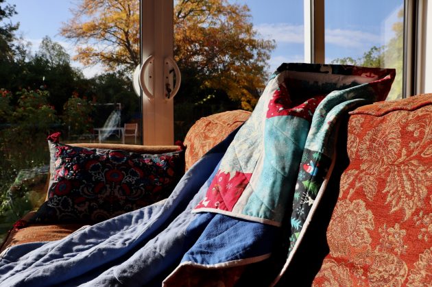 The pattern I used is a simple one from an old book I have called Hand Quilted with Love by Sarah Fielke. I wanted a quick (ha!) project which would showcase the fabric prints and this does the job rather well. I pieced the back from some larger offcuts of our linen/cotton blend fabric, which is a favourite thing of mine to do. I then quilted it in off centre concentric circles.