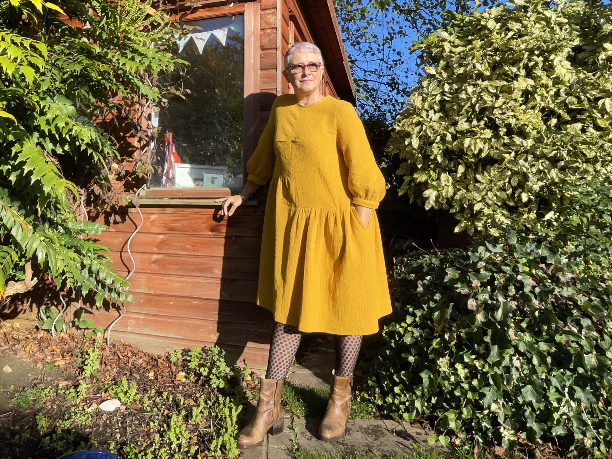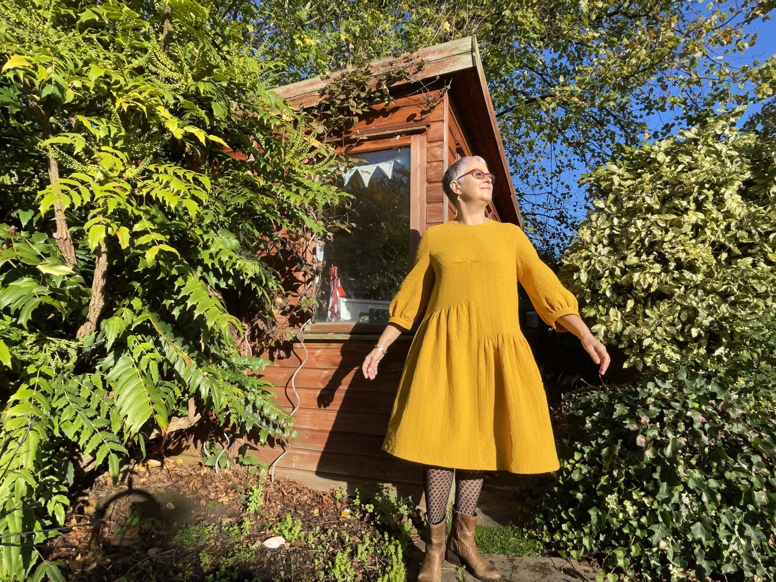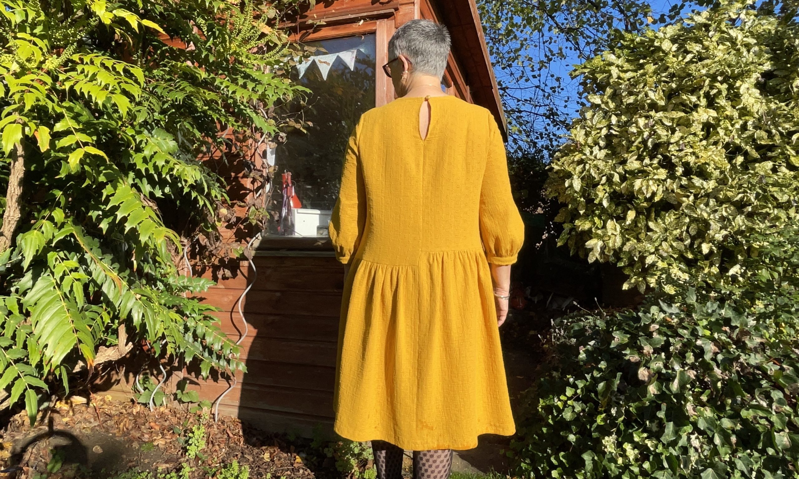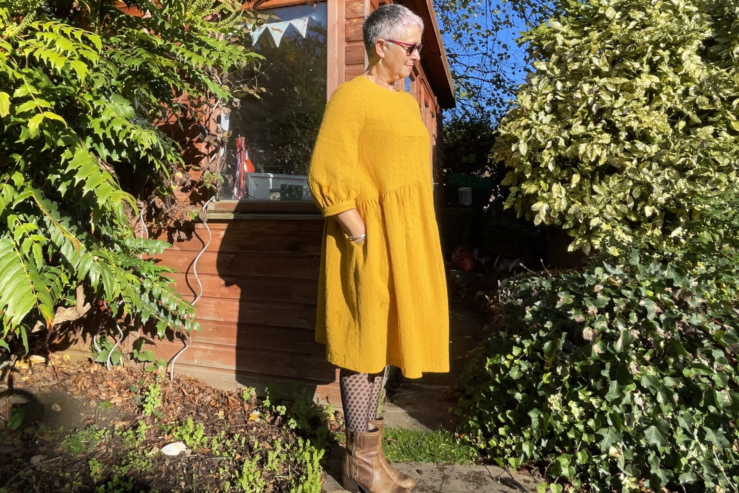 However I wasn’t sure that any of the colours available in the shop at the time I was making it were really very ‘me’ so I plumped for the saffron yellow Broderie Anglaise double gauze instead! [I made this handbrake turn decision partly based on having recently seen a woman wearing a similar style RTW dress made in grey Broderie Anglaise and the fabric looked great, not too ‘girly’ or twee at all]